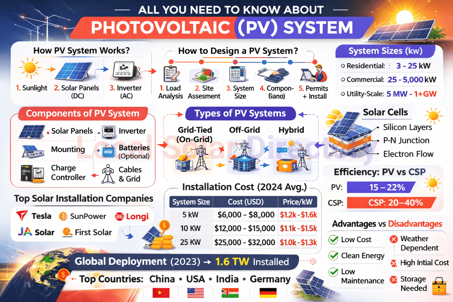 A photovoltaic (PV) system works by turning sunlight into DC electricity inside solar cells and then converting that DC into AC electricity through an inverter for on-site use or grid export.