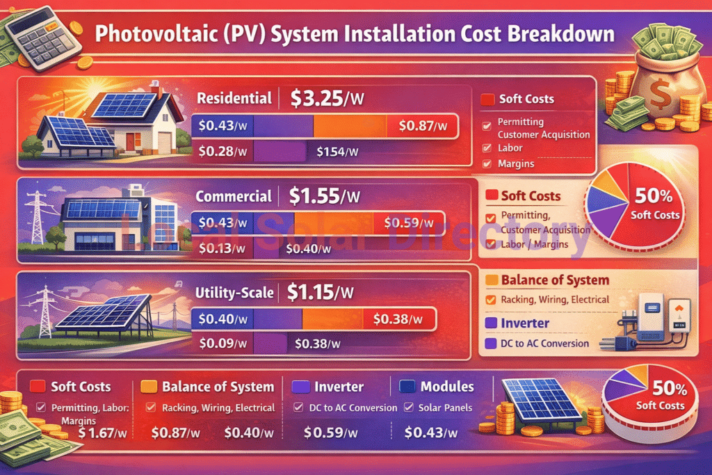 Installation cost of a photovoltaic (PV) system typically ranges from about $1–$4 per Wdc depending on size and market, with utility-scale lowest and residential highest; recent U.S. benchmark “overnight” installed costs for 2024 are about $3.25/Wdc (residential), $1.55/Wdc (commercial), and $1.15/Wdc (utility-scale) in 2024 USD.
