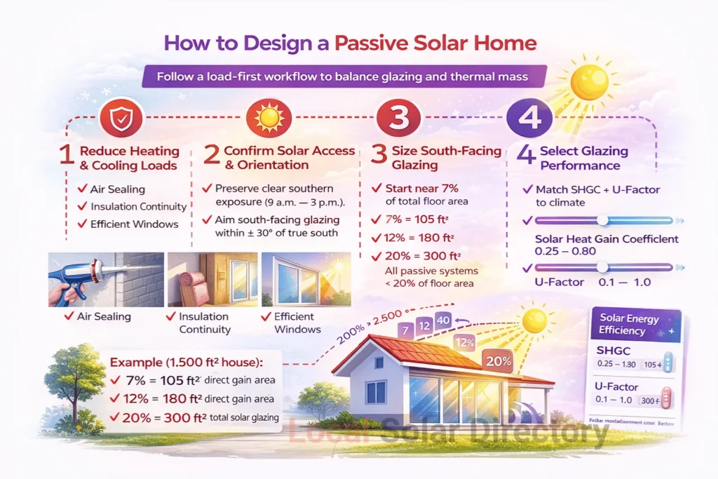 To design a passive solar home, use a load-first workflow that keeps glazing and thermal mass in balance.