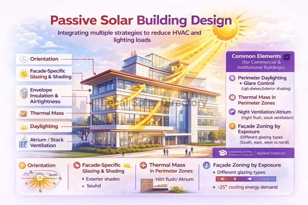 Passive solar building design works by integrating orientation, façade-specific glazing/shading, envelope insulation/airtightness, thermal mass, daylighting, and natural ventilation to reduce HVAC and lighting loads at building scale. The Federal Energy Management Program (FEMP) describes passive solar strategies as the foundation of low-energy building designs and notes that in warm climates these strategies can reduce cooling loads, with measures such as overhangs controlling solar heat gain.