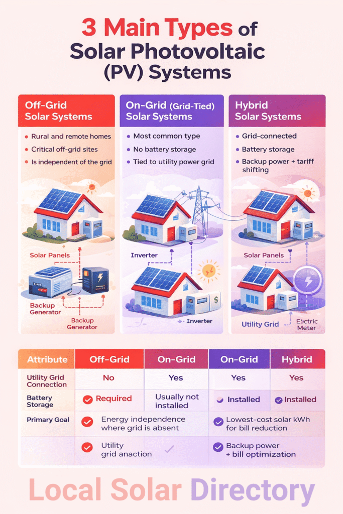 The three main PV system types are defined by grid connection and energy storage: off-grid, on-grid (grid-tied), and hybrid (grid-tied + battery). A solar photovoltaic (PV) system is an electrical power system that converts sunlight into electricity using a PV array and power electronics, then delivers usable AC power to a building, a utility grid, or both.